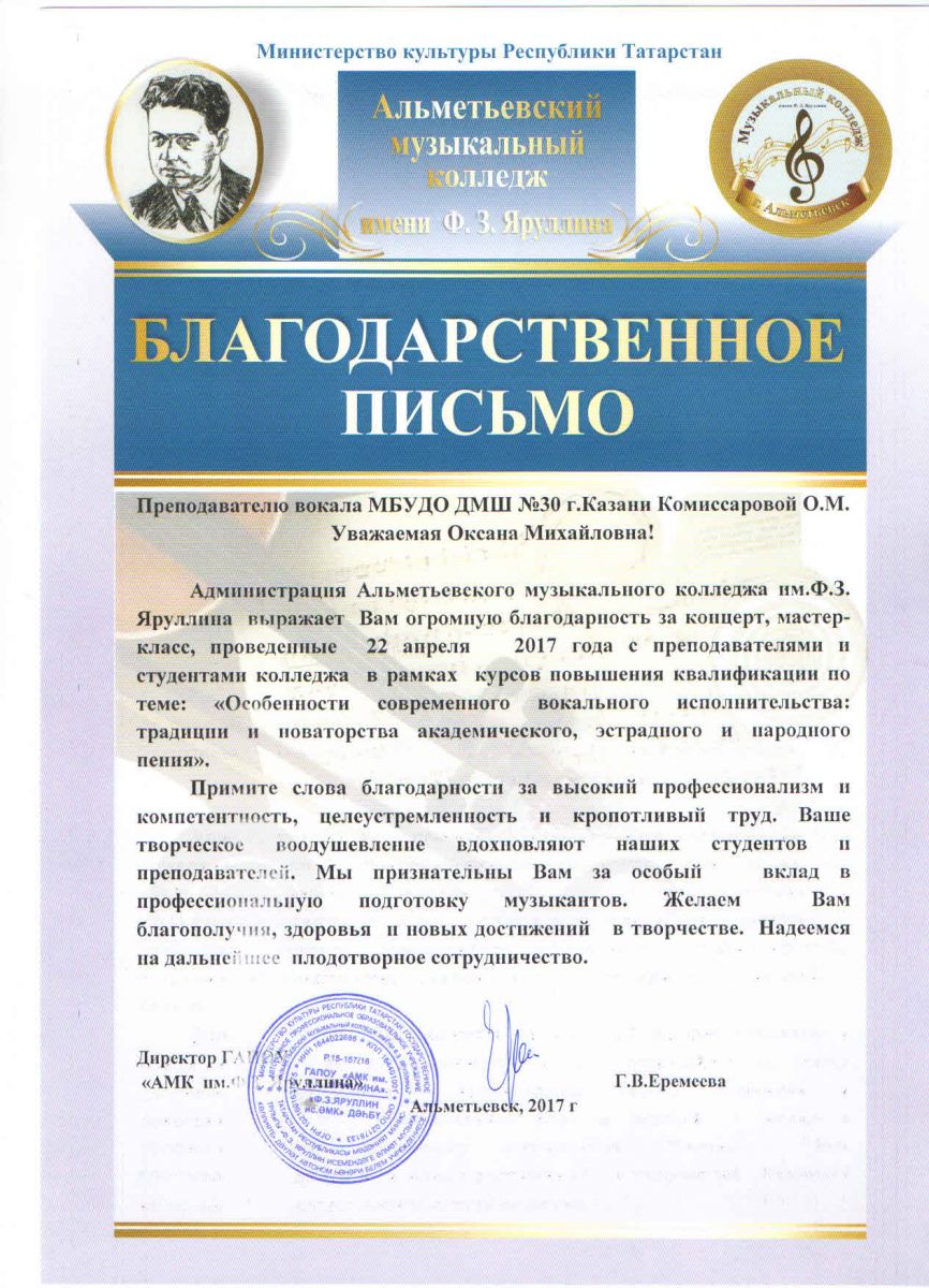 Республиканские курсы повышения квалификации "Особенности современного вокального исполнительсвта: традиции и новаторства академического, эстрадного и народного пения" - Комиссарова О.М. - мастер-классы для преподавателей Альметьевского музыкального колледжа им.Ф.Яруллина