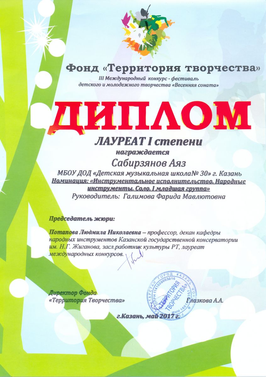 Международная олимпиада детского исполнительского искусства "SFORZANDO" Даутова Амира - диплом