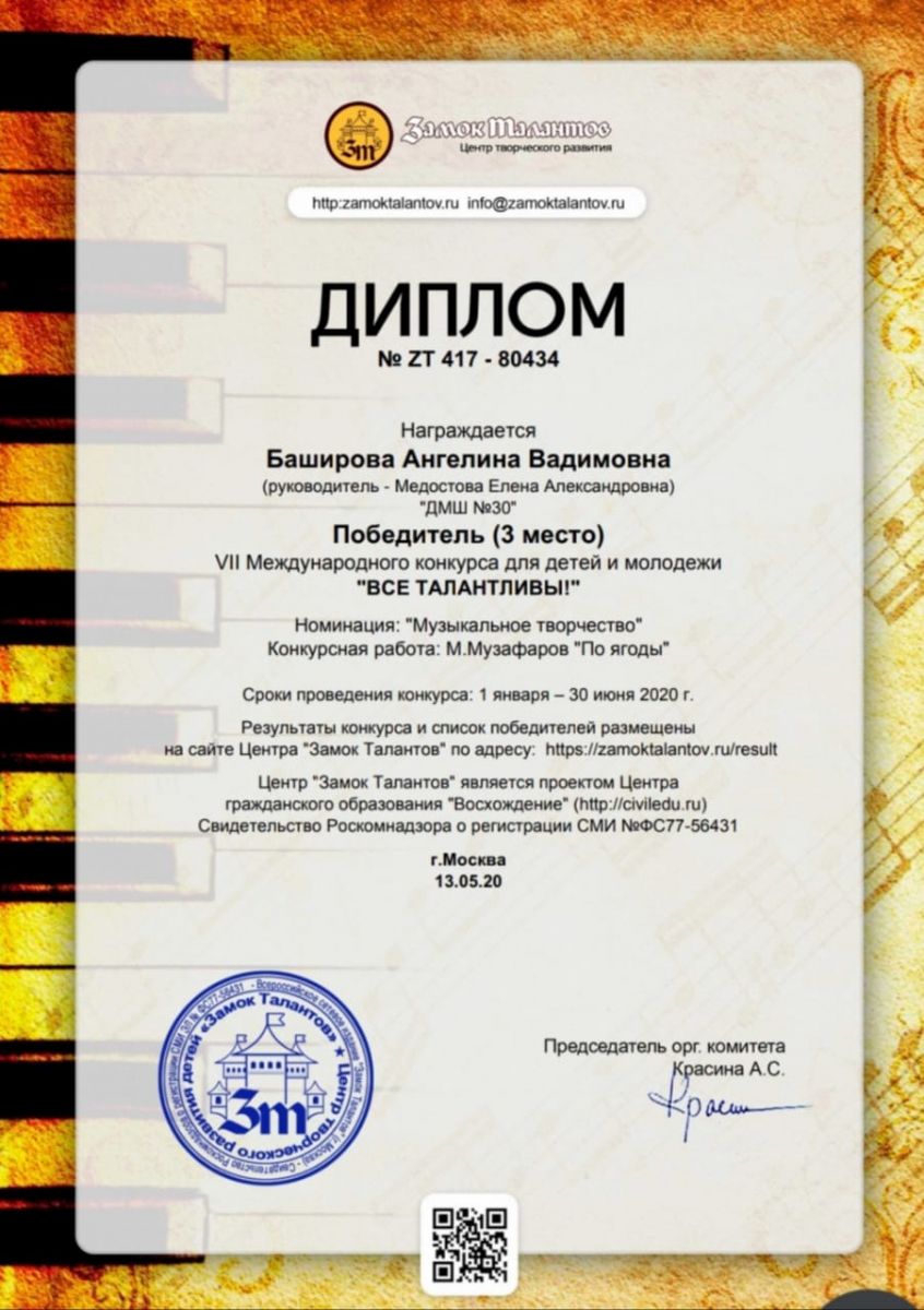 Международный конкурс для детей и молодежи "Все талантливы" - Баширова Ангелина - III место