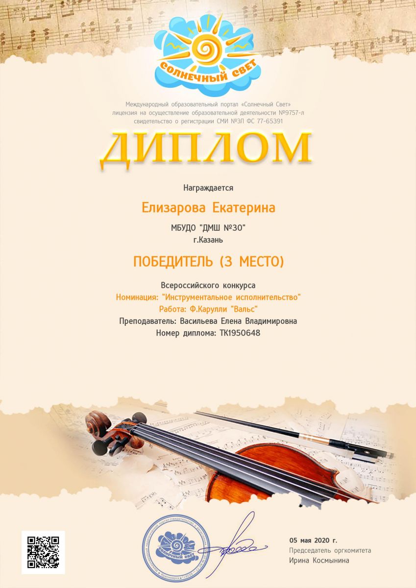 Международный конкурс "Солнечный свет" - Елизарова Екатерина - III место