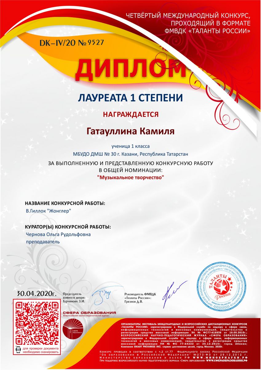 Международный конкурс "Таланты России" - Гатауллина Камиля - I место
