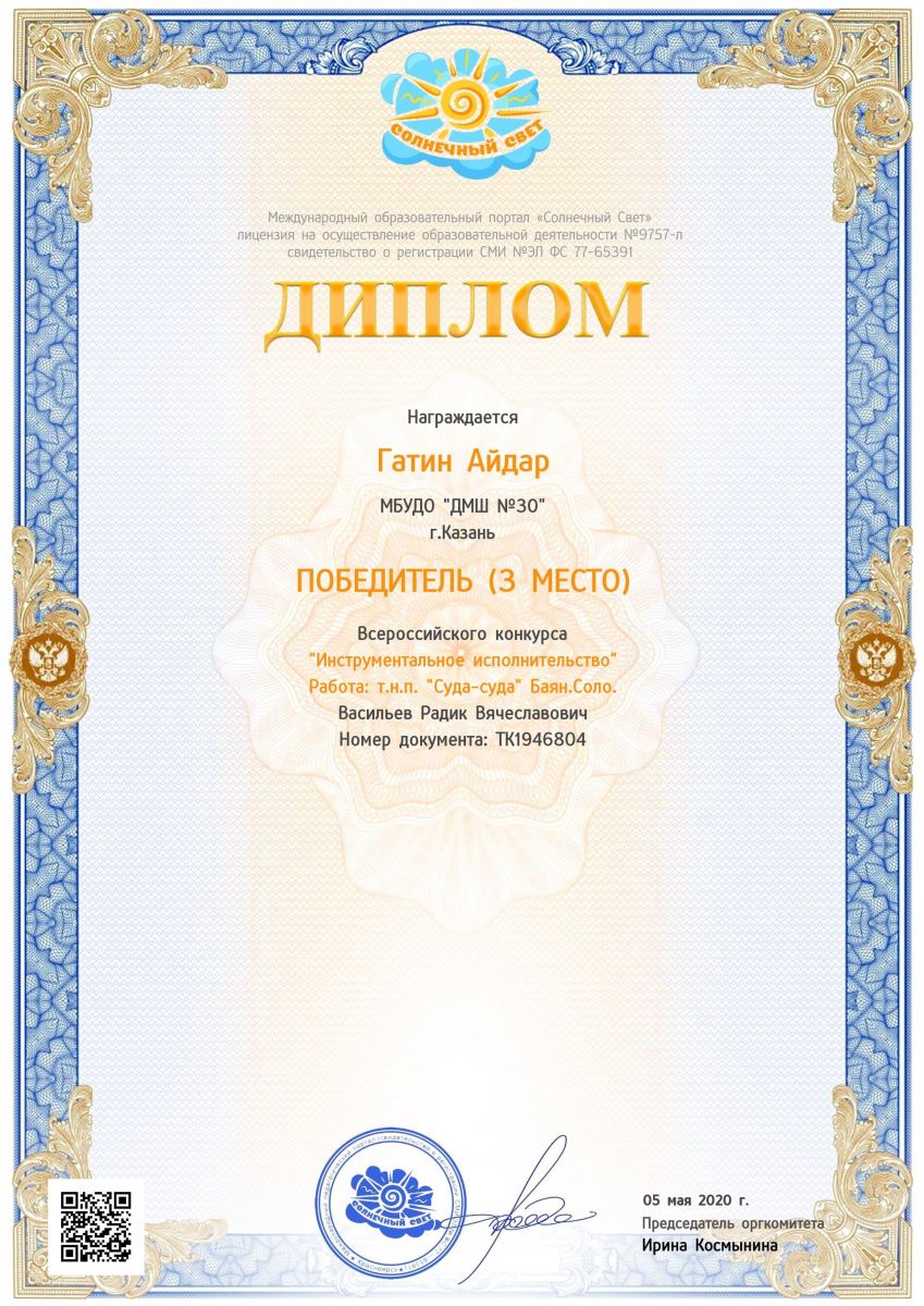 Международный конкурс "Солнечный свет" - Гатин Айдар - III место