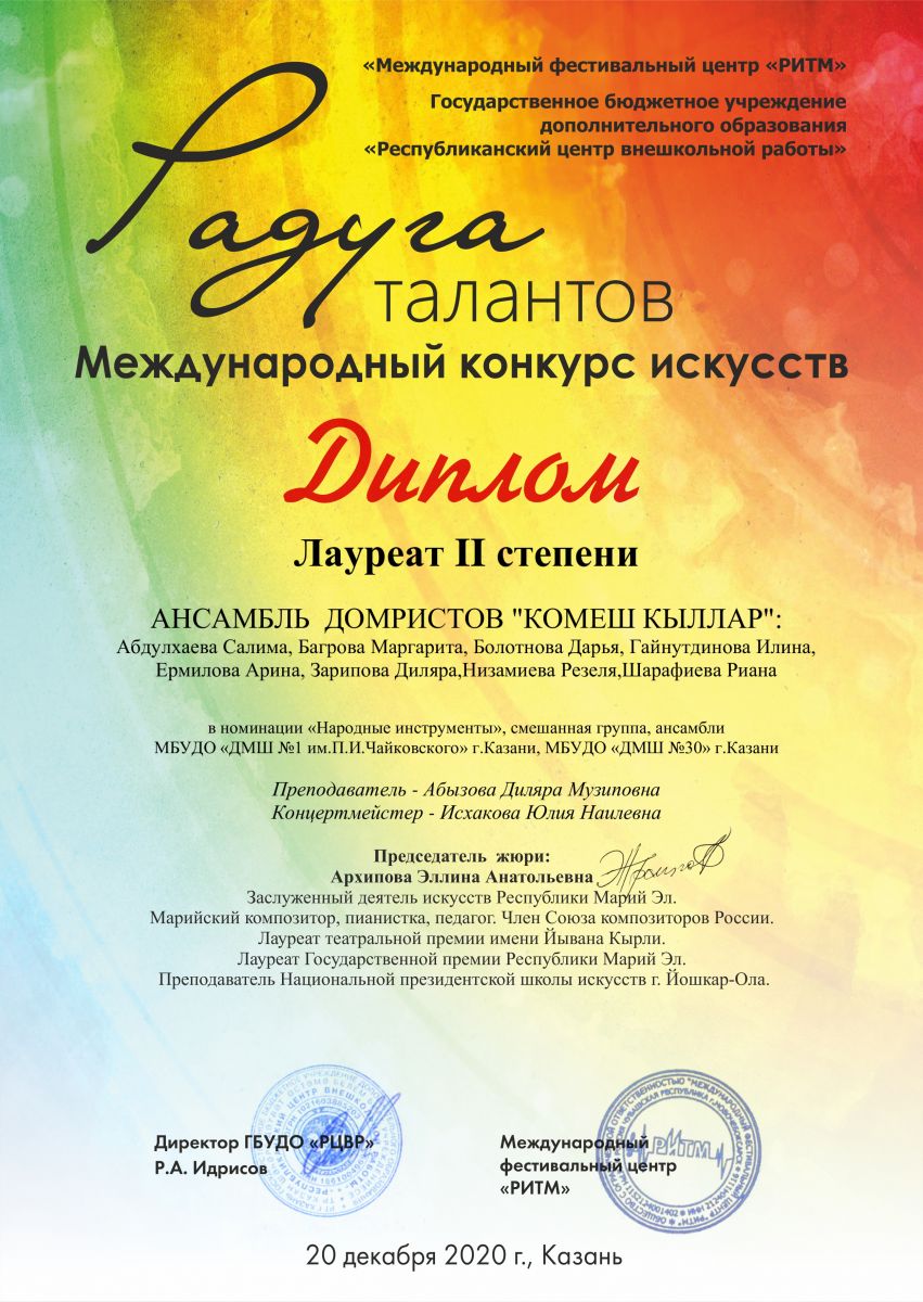 Международный конкурс искусств "Радуга талантов" - ансамбль домристов "Көмеш кыллар" - II место