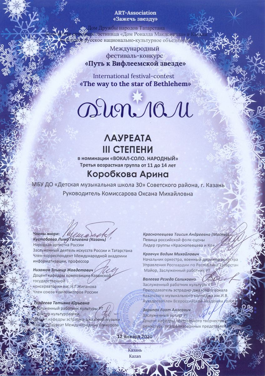 Международный фестиваль-конкурс "Путь к Вифлеемской звезде" - Коробкова Арина - III место