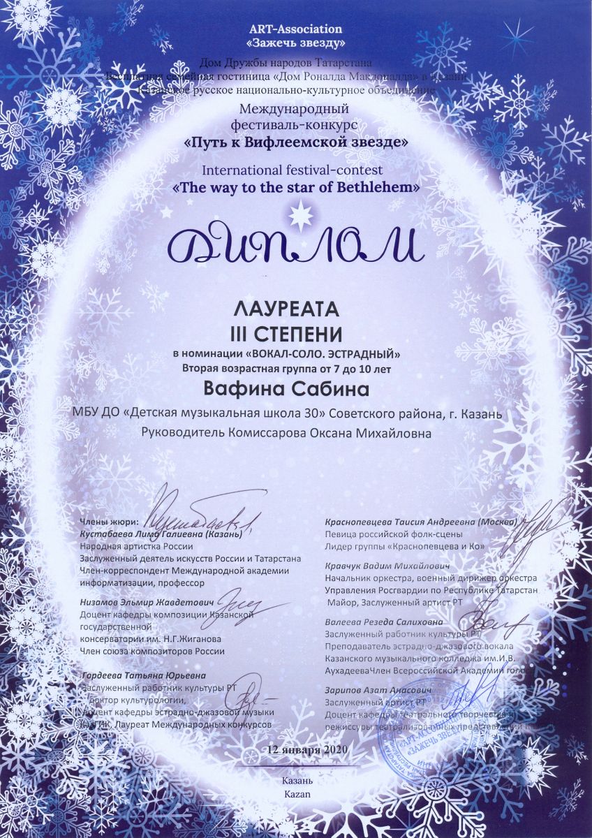 Международный фестиваль-конкурс "Путь к Вифлеемской звезде" - Вафина Сабина - III место