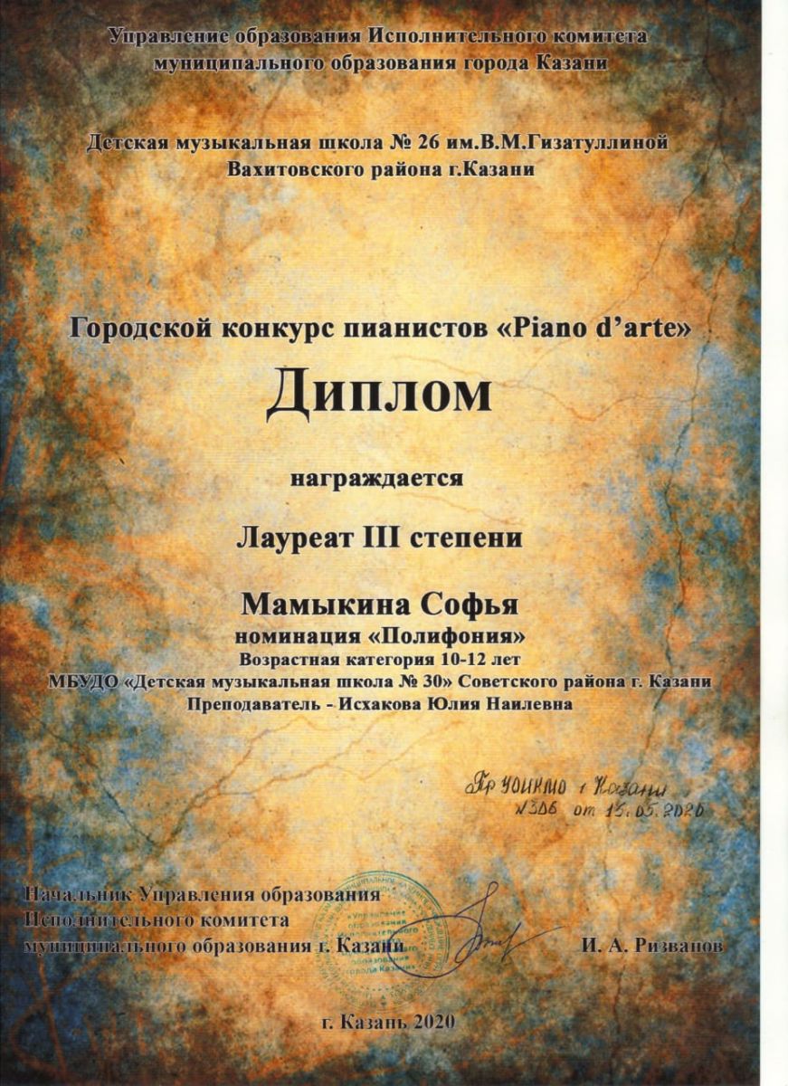 Городской конкурс пианистов "Piano d' arte" - Мамыкина Софья - III место (номинация "полифония")