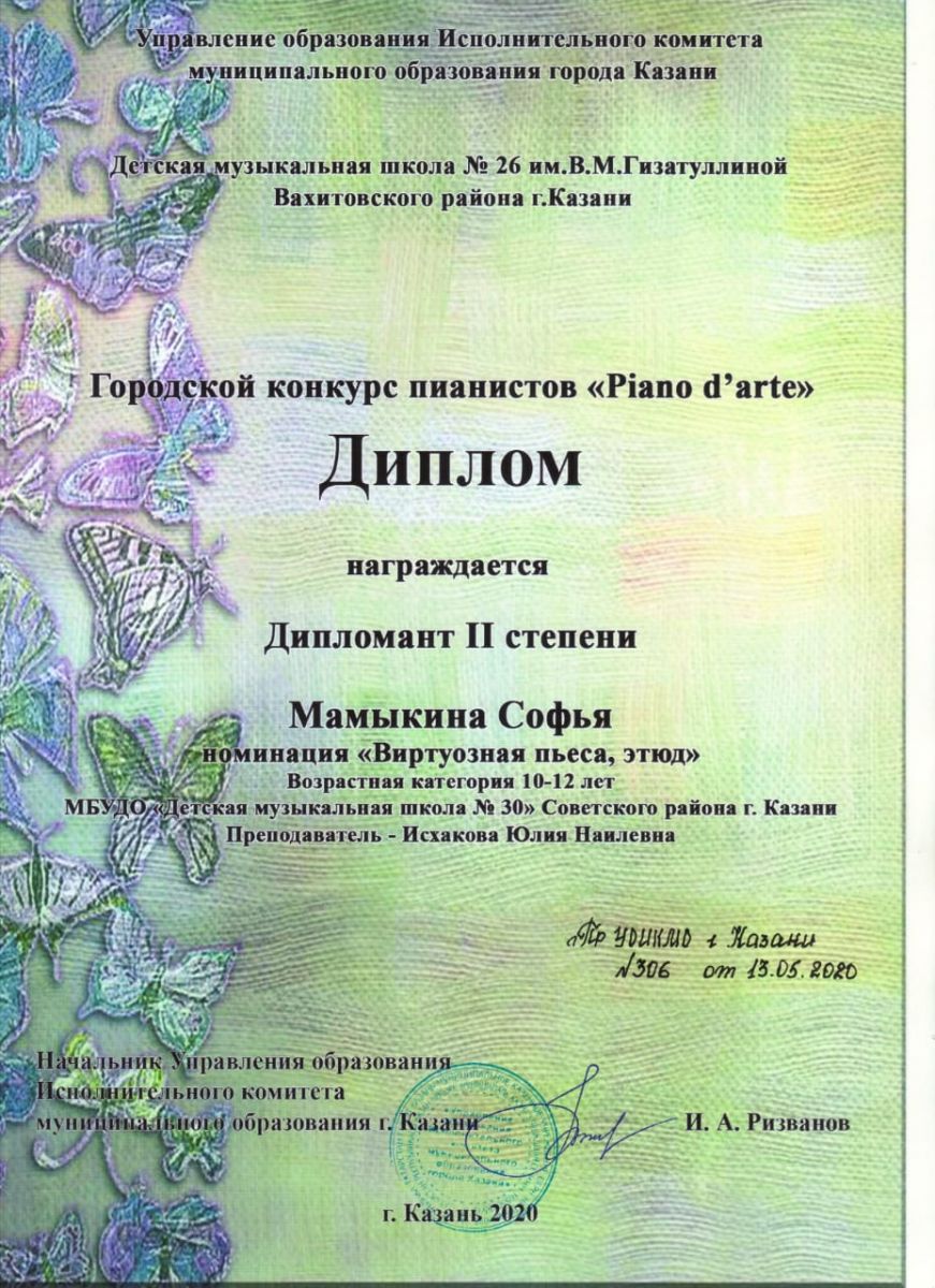 Городской конкурс пианистов "Piano d' arte" - Акмаева Элиза - диплом I степени