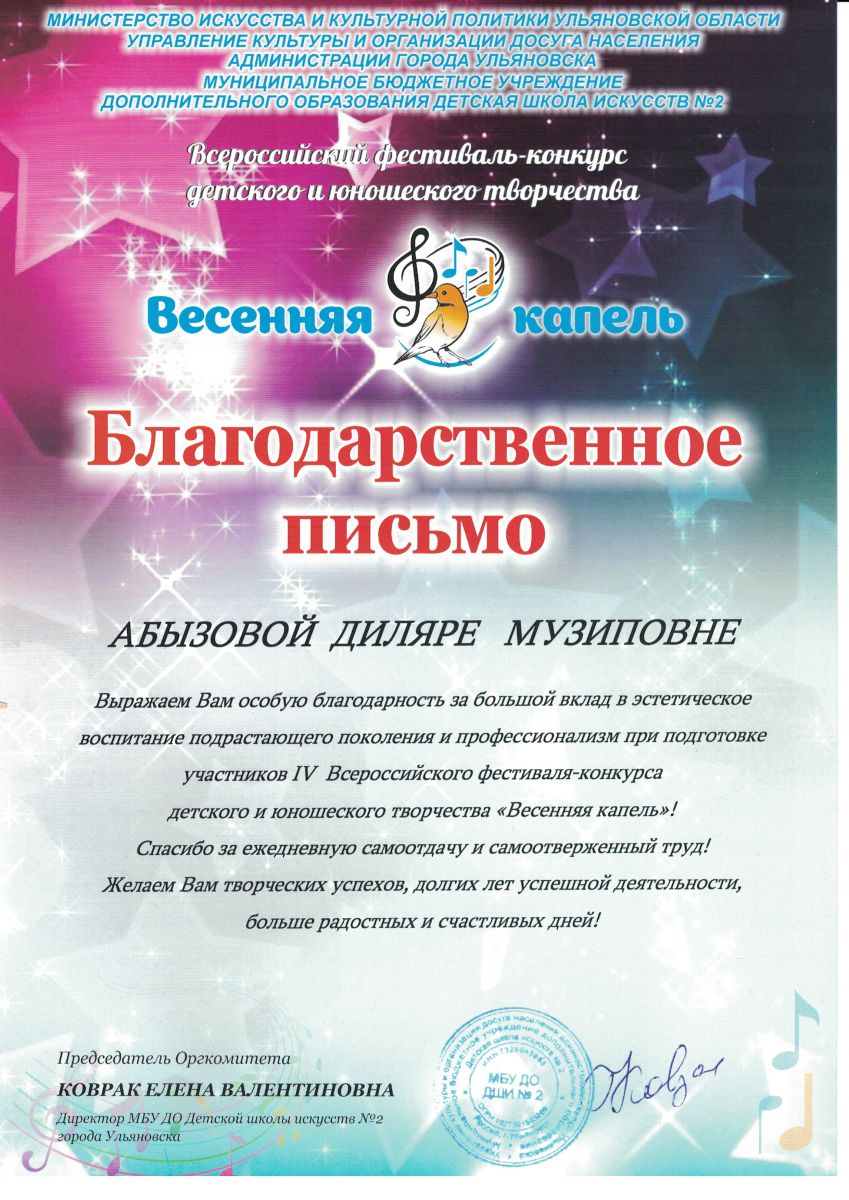 Всероссийский фестиваль-конкурс детского и юношеского творчества "Весенняя капель" - Абызова Д.М. - Благодарственное письмо