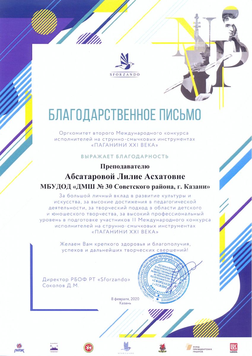 II Международный конкурс исполнителей на струнно-смычковых инструментах "Паганини XXI века" - Абсатарова Л.А. - Благодарственное письмо