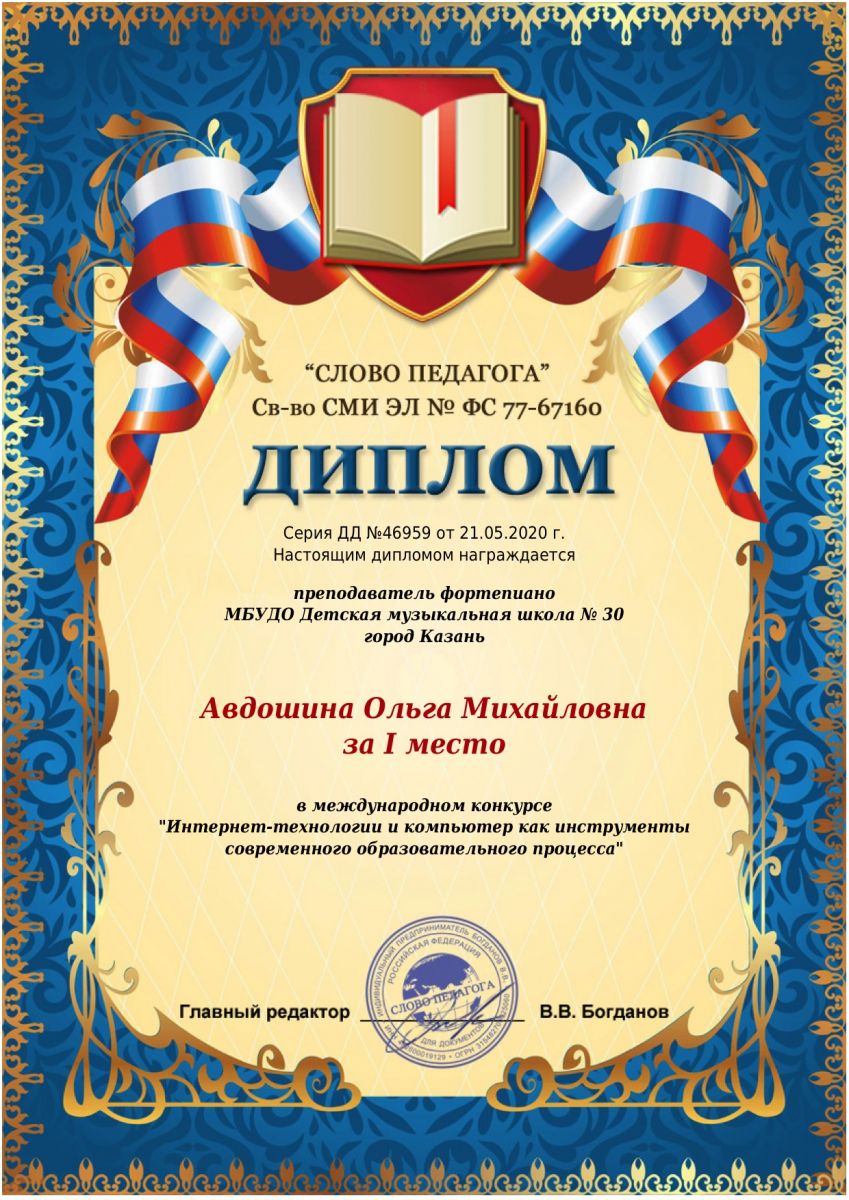 Международный конкурс "Слово педагога" - Авдошина О.М. - I место