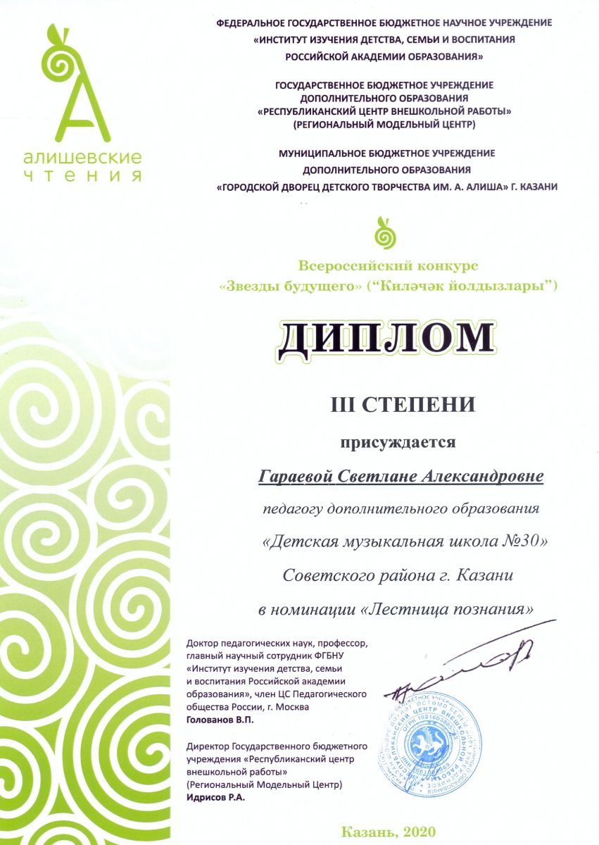 Всероссийский конкурс "Звезды будущего" ("Киләчәк йәлдызлары") в рамках Алишевских чтений - Гараева С.А. - диплом III степени в номинации "Лестница познания"