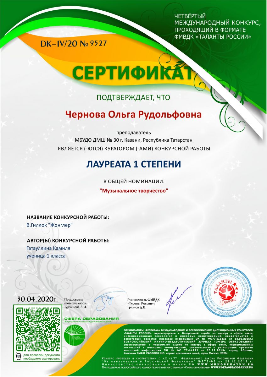 Международный конкурс "Таланты России"- Чернова О.Р. - сертификат о подготовке лауреата I степени Гатауллиной Камили