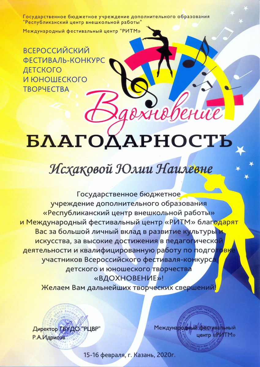 Всероссийский фестиваль-конкурс детского и юношеского творчества "Вдохновение" - Исхакова Ю.Н. - Благодарственное письмо