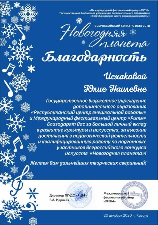 Всероссийский конкурс искусств "Новогодняя планета" - Исхакова Ю.Н. - Благодарственное письмо