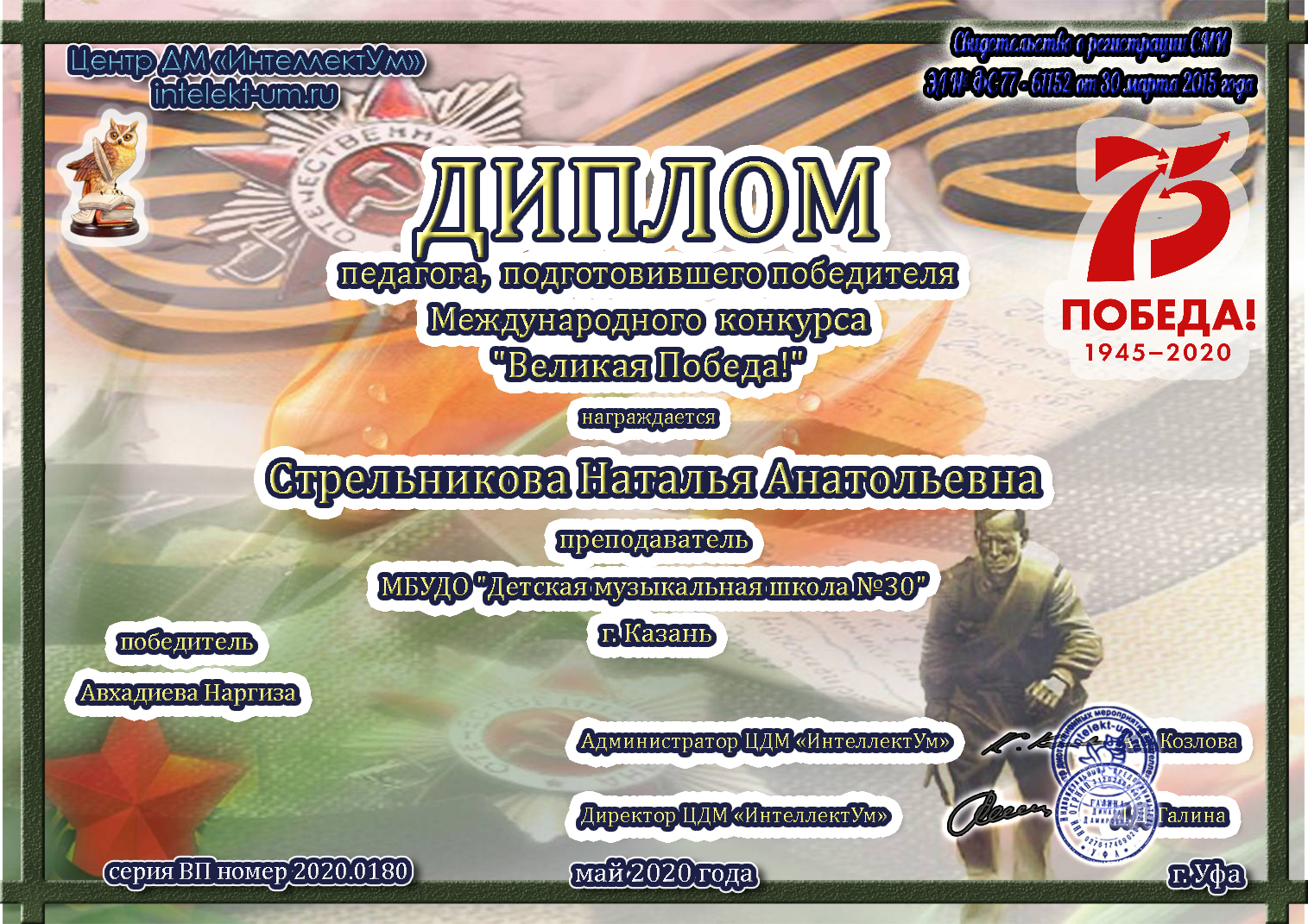 Международный конкурс "Великая Победа" - Стрельникова Н.А. - Диплом за подготовку победителя конкурса