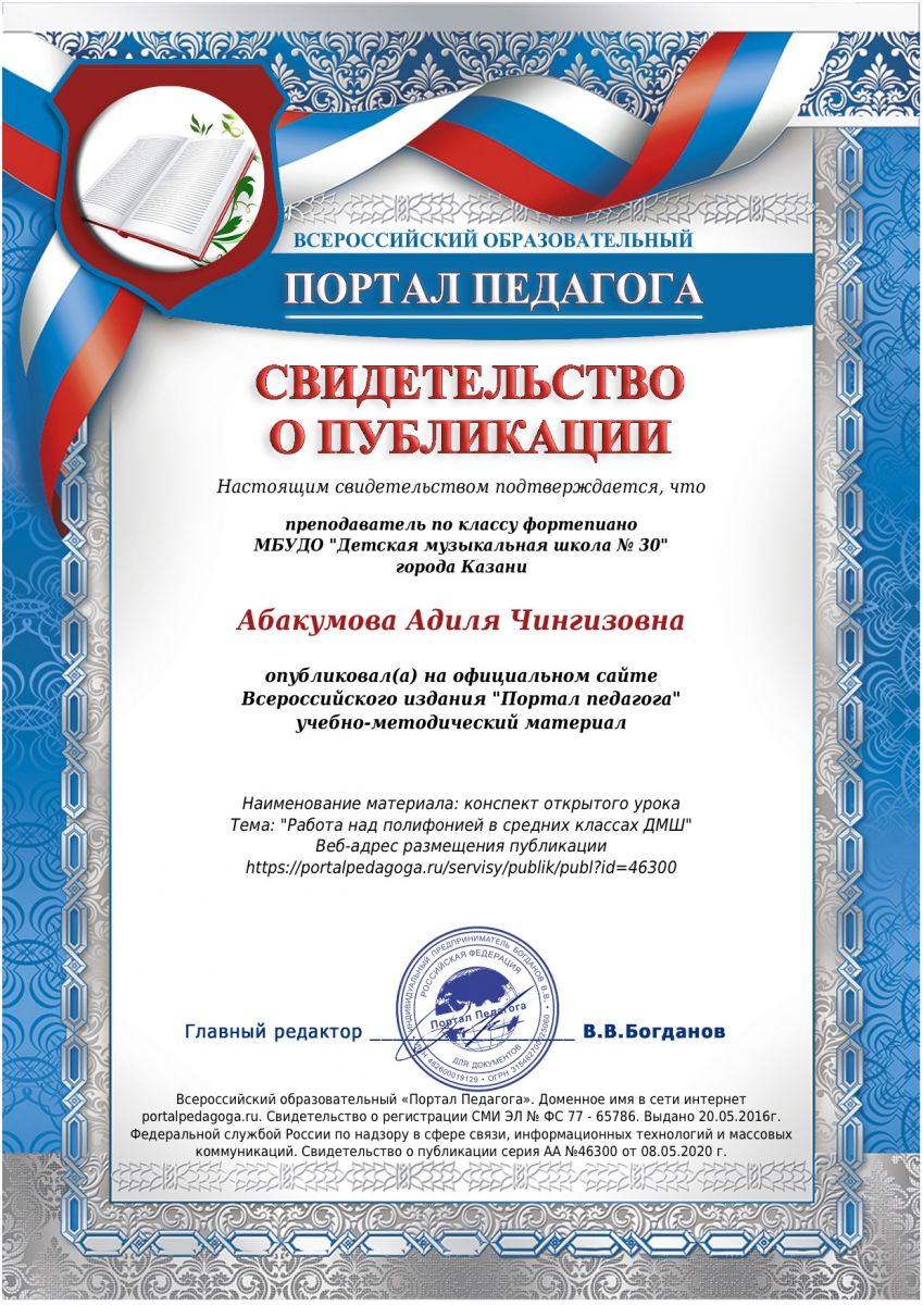 Всероссийское издание "Портал педагога" - статья Абакумовой А.Ч. "Работа над полифонией в средних классах ДМШ"