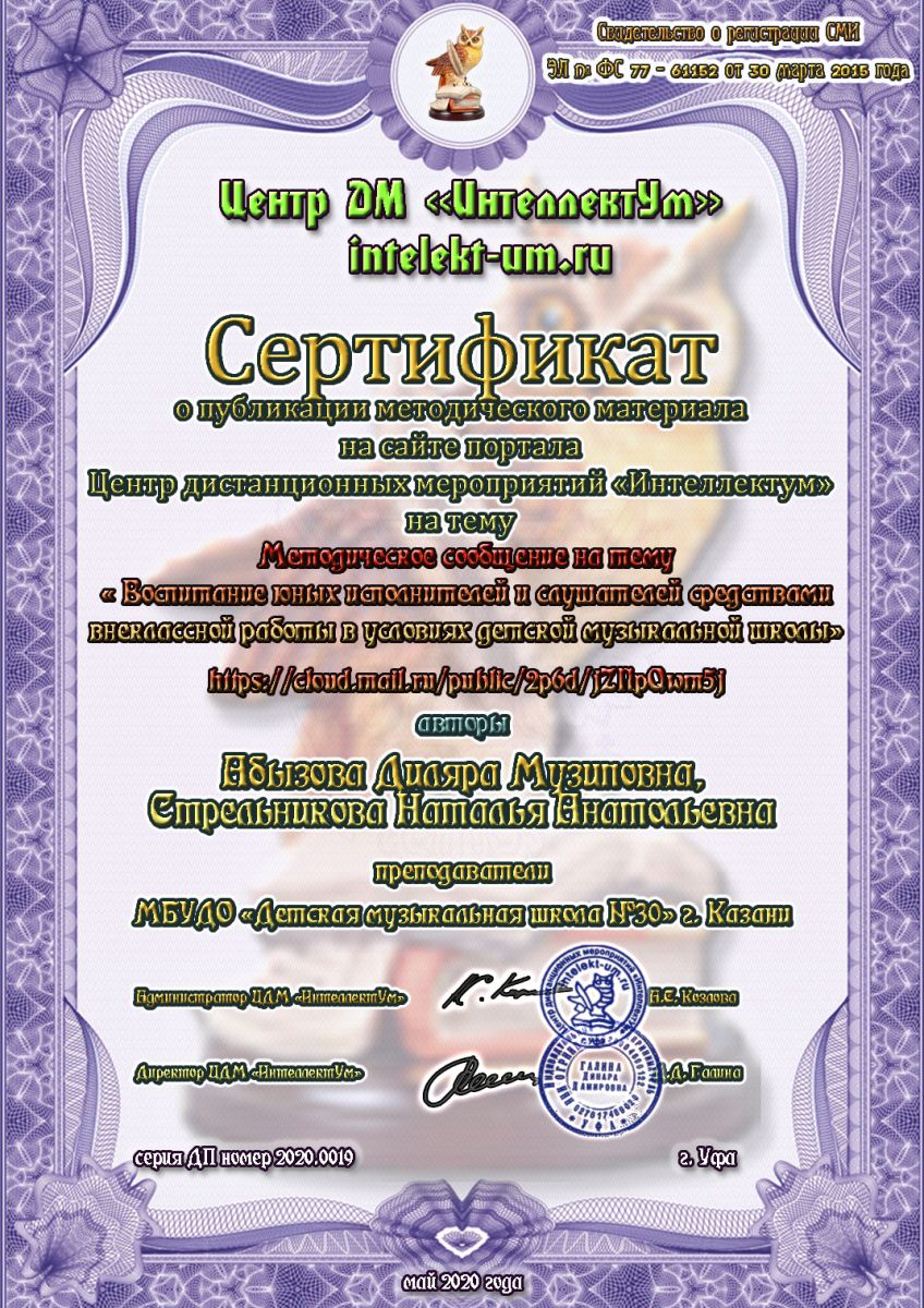 Сайт портала "ИнтеллектУм" - статья Абызовой Д.М. и Стрельниковой Н.А. "Воспитание юных исполнителей и слушателей средствами внеклассной работы в ДМШ"