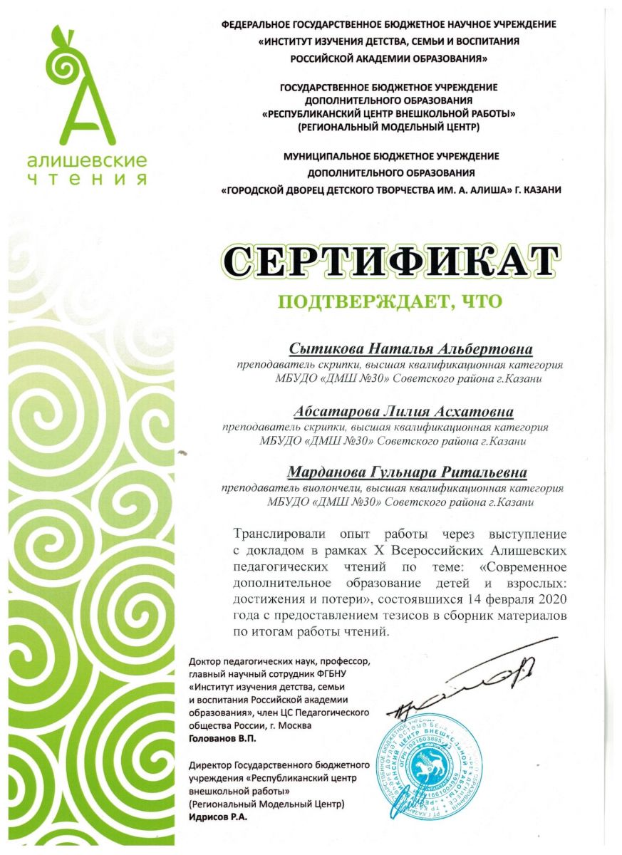 Сборник материлов X Всероссийских Алишевских педагогических чтений по теме "Современное дополнительное образование детей и взрослых: достижения и потери" - статья Абсатаровой Л.А. "Из опыта работы с группой скрипачей сводного детского струнного оркестра "Tutti".