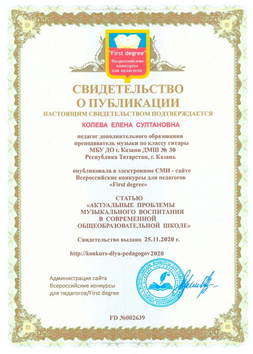 Всероссийски электронный СМИ-сайт конкурса для педагогов "First degree" - Статья Колевой Е.С. "Актуальные проблемы музыкального воспитания в современной общеобразовательной школе"