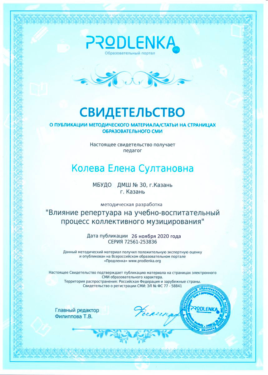 Всероссийский образовательный портал "PRODLENKA" - статья Колевой Е.С. "Влияние репертуара на учебно-воспитательный процесс коллективного музицирования"