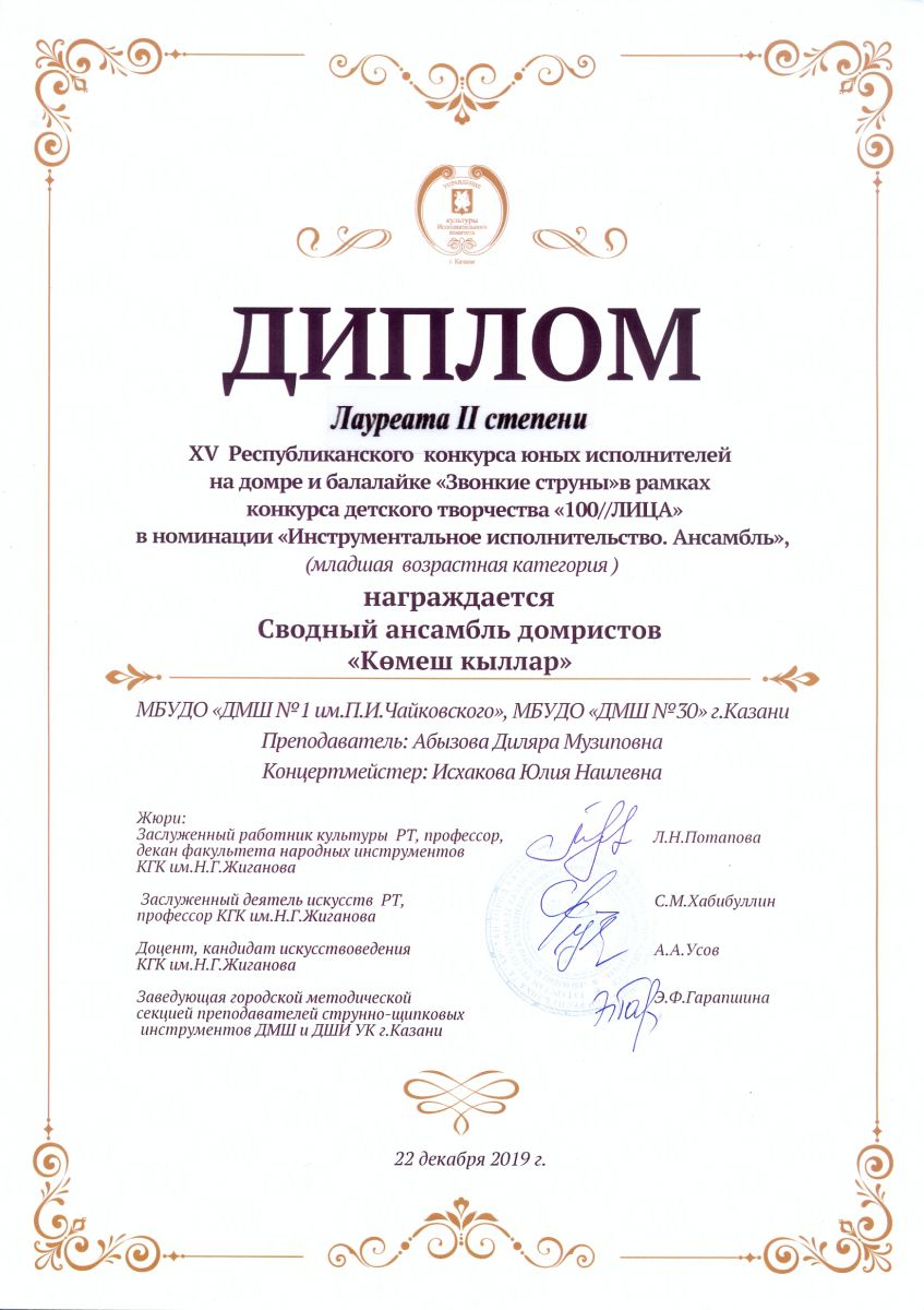 XV Республиканский конкурс юных исполнителей на домре и балалайке "Звонкие струны" в рамках конкурсах детского творчества "100//ЛИЦА" - сводный ансамбль домристов "Көмеш кыллар" - II местоРеспубликанская творческая программа для юных музыкантов "Звезды из завтра" - сводный ансамбль домристов "Көмеш кыллар" - диплом участника