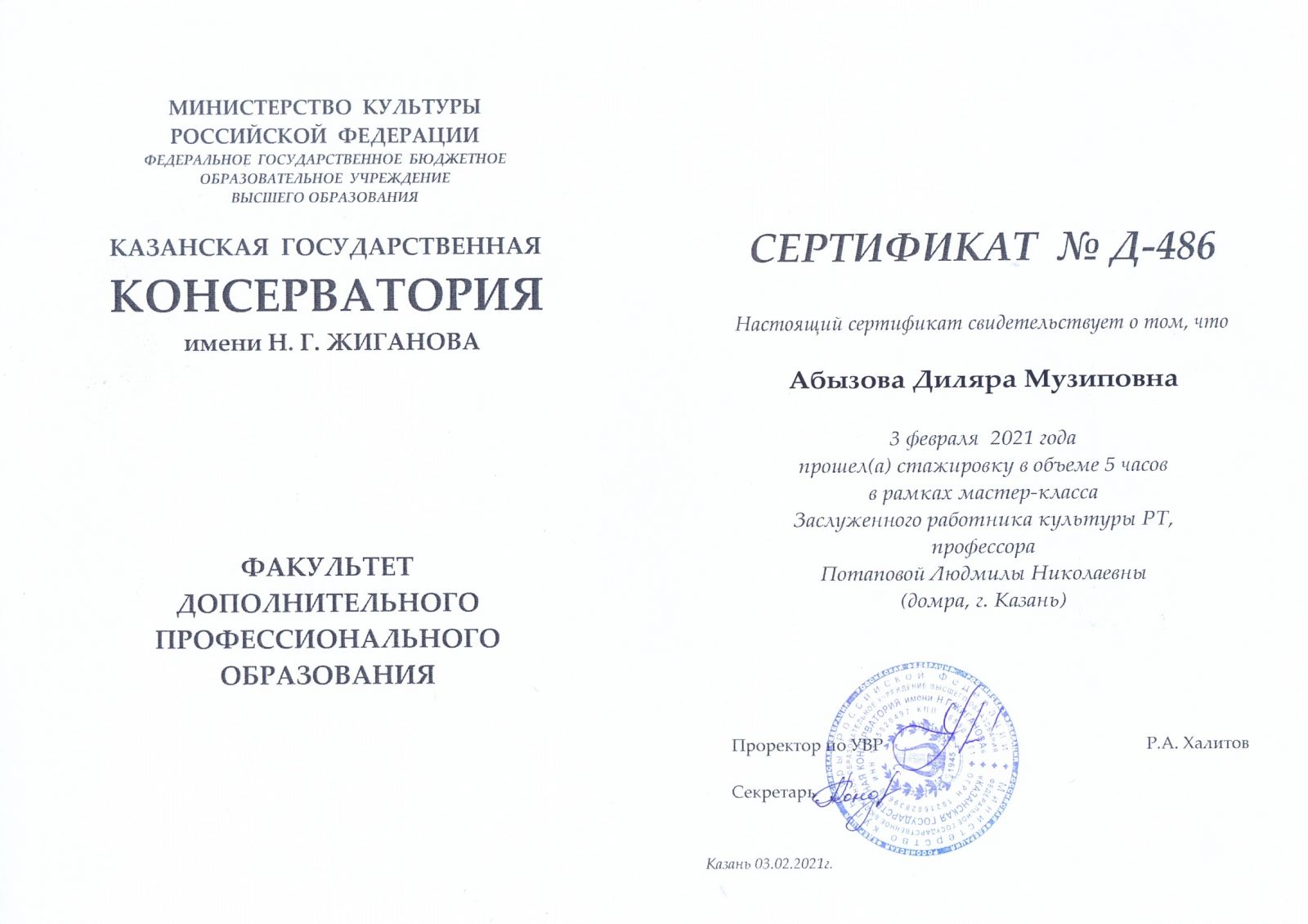 Стажировка в рамках мастер-класса Заслуженного работника культуры РТ, профессора Потаповой Л.Н. (домра, Казань) - Абызова Д.М. - Сертификат