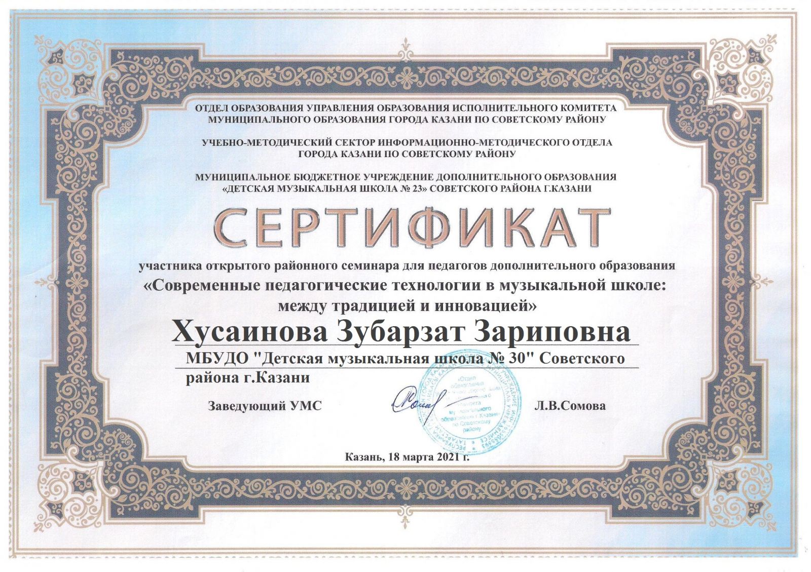 Открытый районный семинар для педагогов дополнительного образования "Современные педагогические технологии в музыкальной школе: между традицией и инновацией" - Хусаинова З.З. - Сертификат