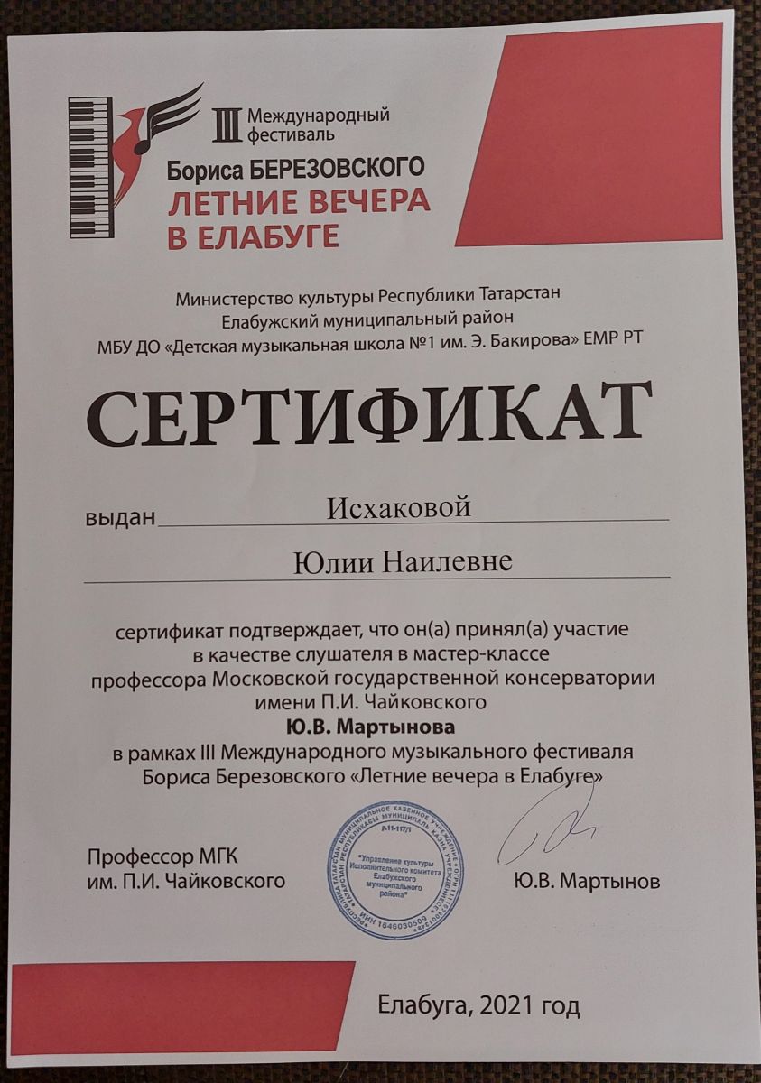 Мастер-класс профессора Московской государственной консерватории им.П.И.Чайковского Ю.В.Мартынова в рамках III Международного музыкального фестиваля Бориса Березовского "Летние вечера в Елабуге"  - Исхакова Ю.Н. - сертификат