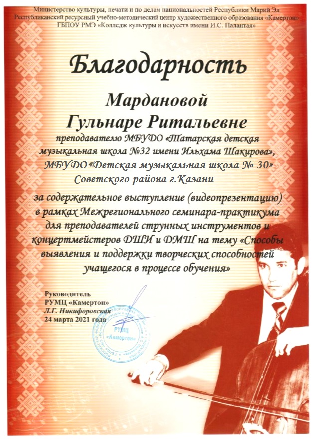 Открытый районный семинар для педагогов дополнительного образования "Современные педагогические технологии в музыкальной школе: между традицией и инновацией" - Камалова Ю.З. - Сертификат