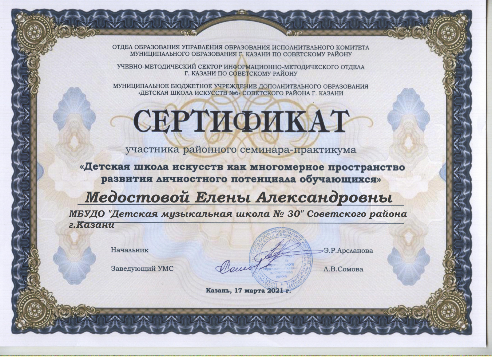 Районный семинар-практикум "Детская школа искусств как многомерное пространство развития личностного потенциала обучающихся" - Медостова Е.А. - Сертификат