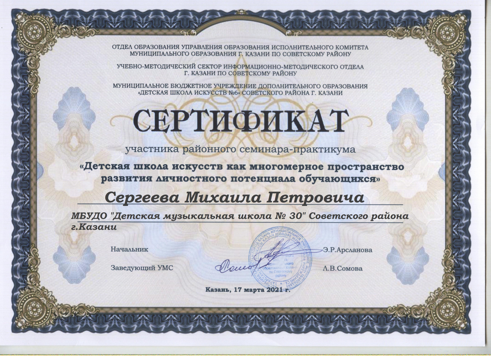 Районный семинар-практикум "Детская школа искусств как многомерное пространство развития личностного потенциала обучающихся" - Сергеев М.П. - Сертификат