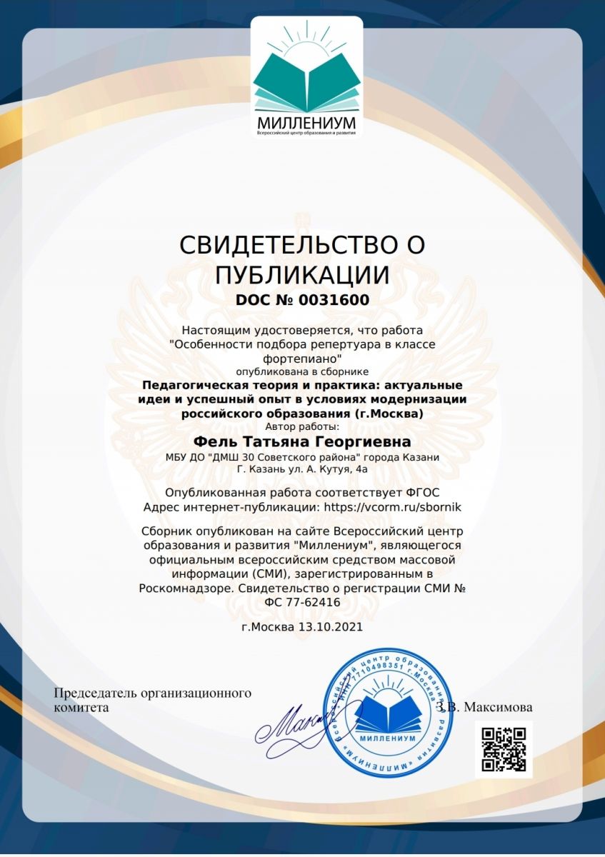 Всероссийский центр образования и развития "Миллениум" в сборнике "Педагогическая теория и практика: актуальные идеи и успешный опыт в условиях модернизации Российского образования" (г.Москва) - статья Фель Т.Г. "Особенности подбора репертуара в классе фортепиано"