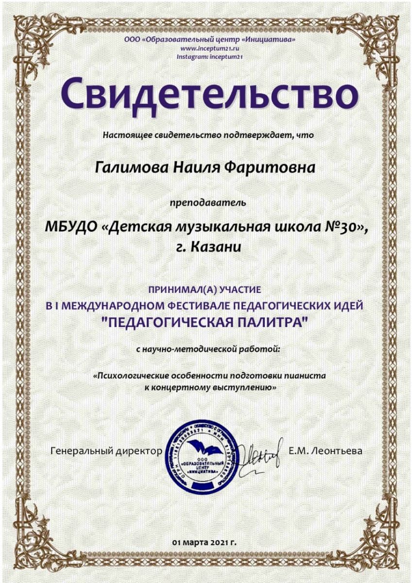 ООО "Образовательный центр "Инициатива" I Международный фестиваль педагогических идей "Педагогическая палитра" - научно-педагогическая работа Галимова Н.Ф. "Психологические особенности подготовки пианиста к концертному выступлению"