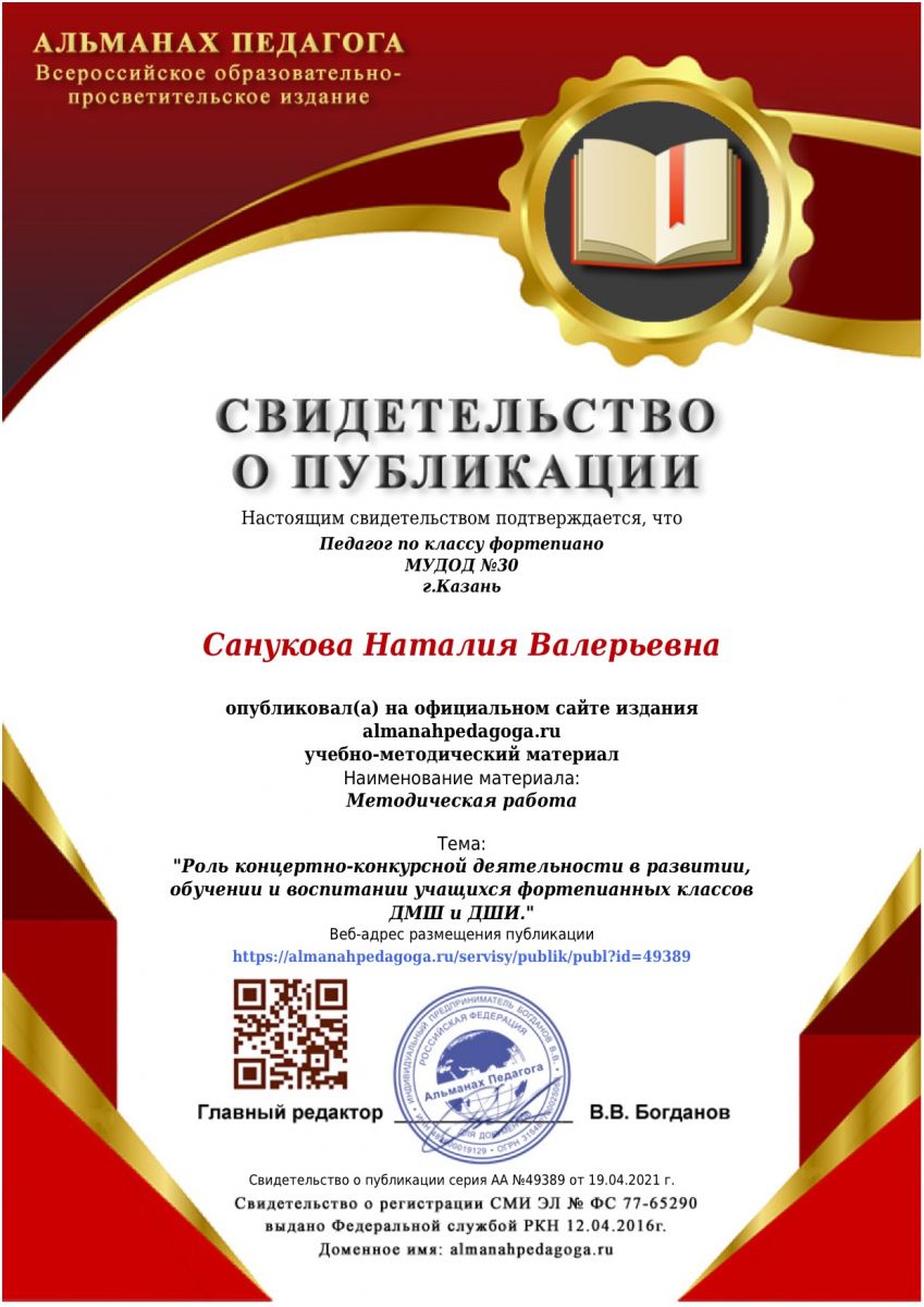 Всероссийское образовательно-просветительское издание "Альманах педагога" - статья Сануковой Н.В. "Роль концертно-конкурсной деятельности в развитии, обучении и воспитании учащихся фортепианных классов ДМШ и ДШИ"