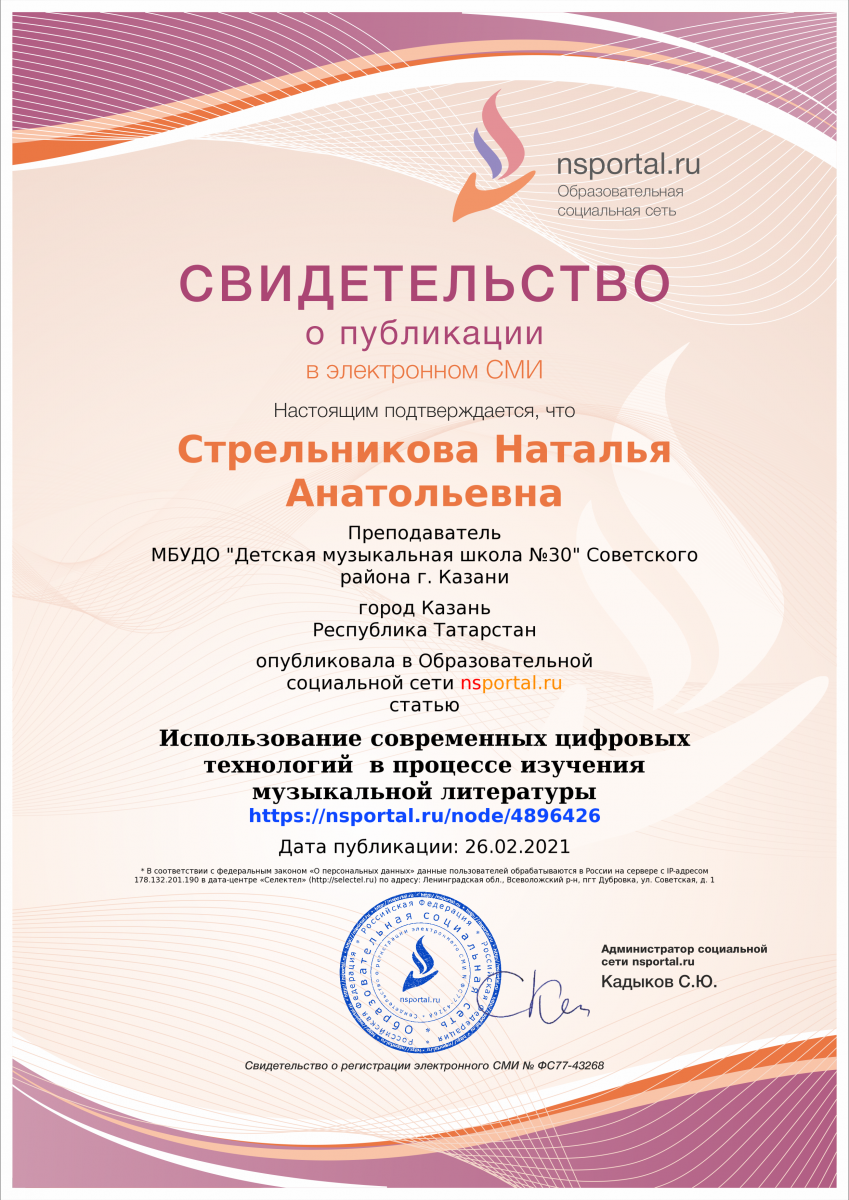 Электронне СМИ nsportal.ru Образовательная социальная сеть - статья Стрельниковой Н.А. "Использование современныхцифровых технологий в процессе изучения музыкуальной литературы"