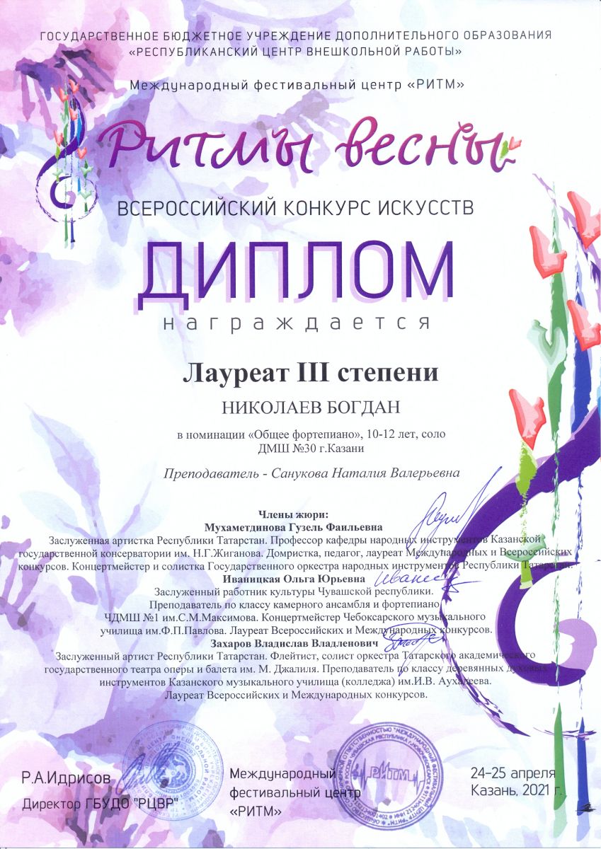 Всероссийский конкурс искусств "Ритмы весны" - Николаев Богдан - III место
