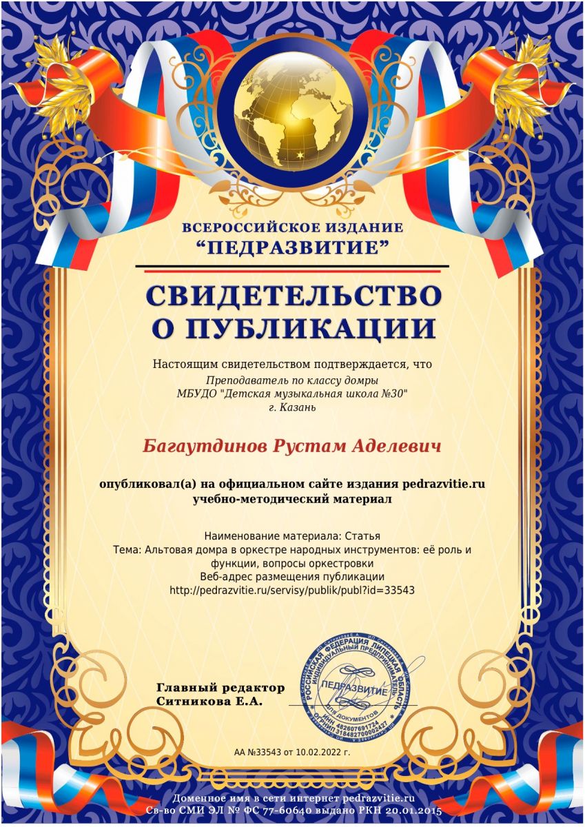 Всероссийское издание "Педразвитие" - статья Багаутдинова Р.А. "Альтовая домра в оркестре народных инструментов: её рольт и функции, вопросы оркестровки"