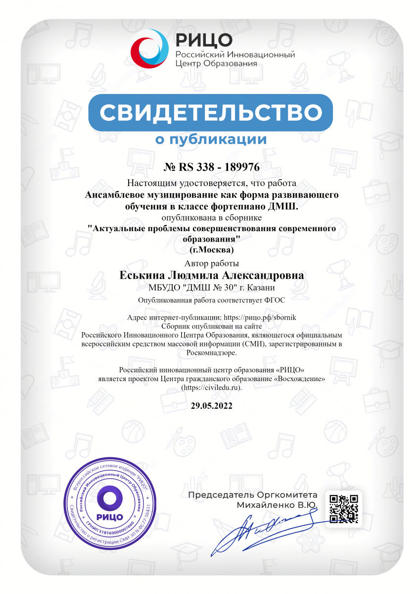 Российский Инновационный центр образования. Сборник "Актуальные проблемы совершенствования современного образования" (г.Москва) - Еськина Л.А. опубликовала статью "Ансамблевое музицирование как форма рузвивающего обучения в классе фортепиано ДМШ" - свидетельство