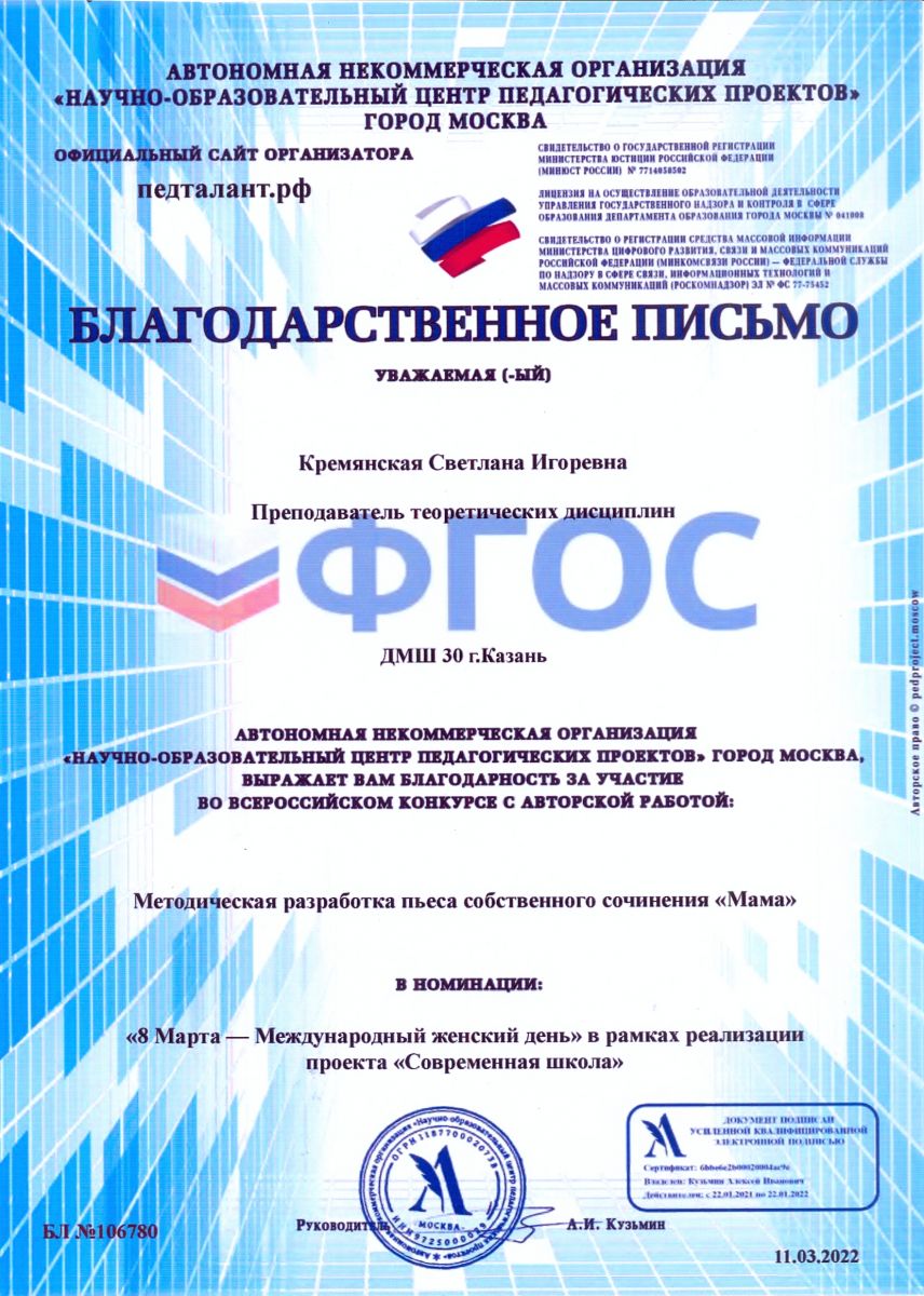 Всероссийский информационно-образовательный портал профессионального мастерства педагогических работников "Педагогические таланты России" - Кремянская С.И. опубликовала авторский материал  "Методическая разработка пьеса собственного сочинения "Мама" - Благодарственное письмо