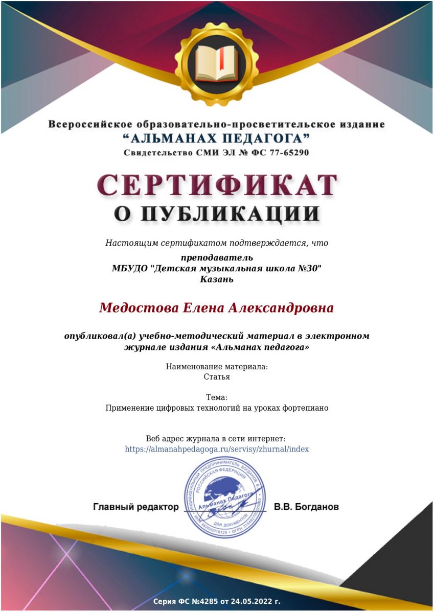 Всероссийское образовательно-просветительское издание "Альманах педагога" - Медостова Е.А. опубликовала статью "Применение цифровых технологий на уроках фортепиано" - сертификат