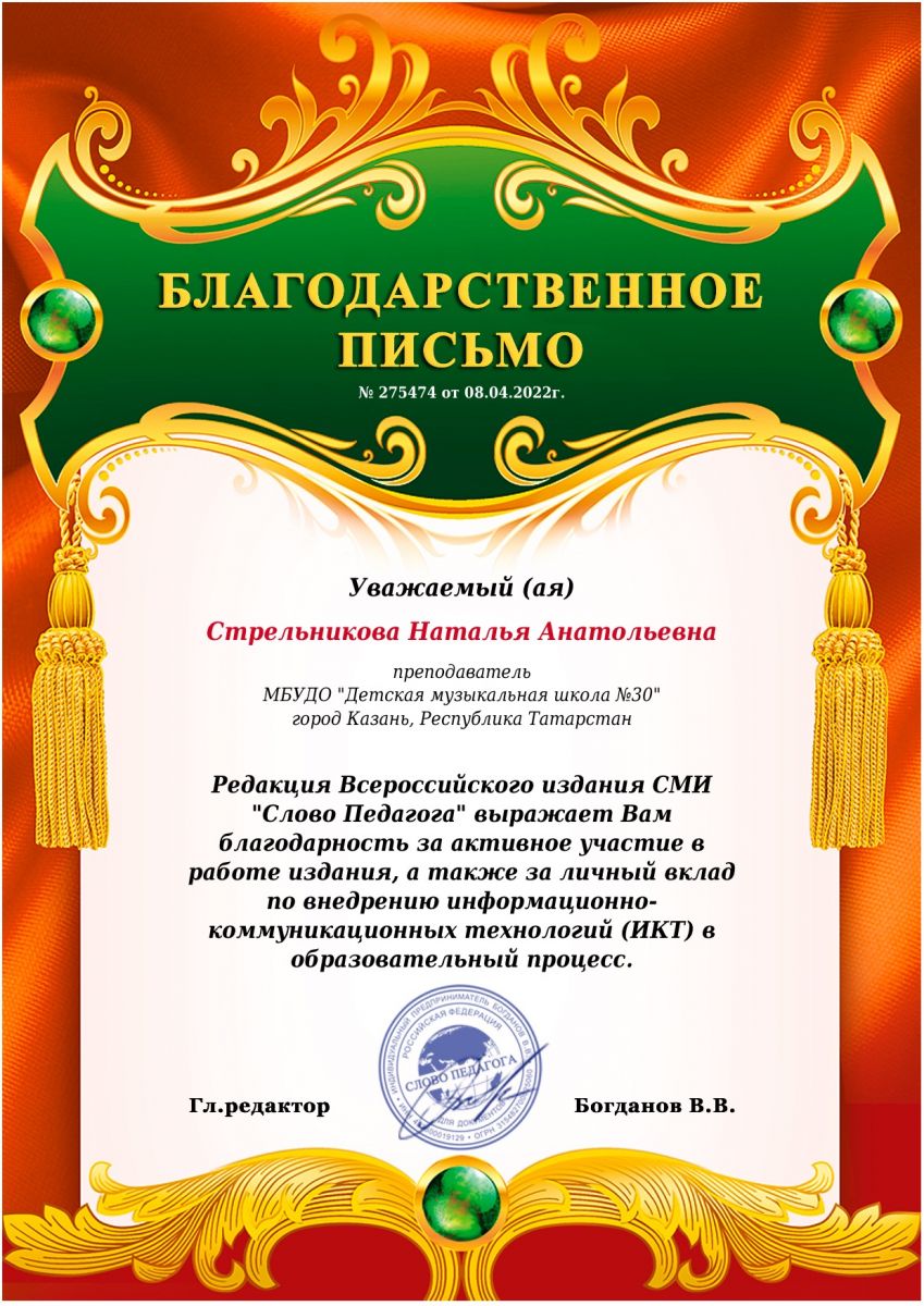 Всероссийское издание СМИ "Слово педагога" - Стрельникова Н.А. - Благодарственное письмо