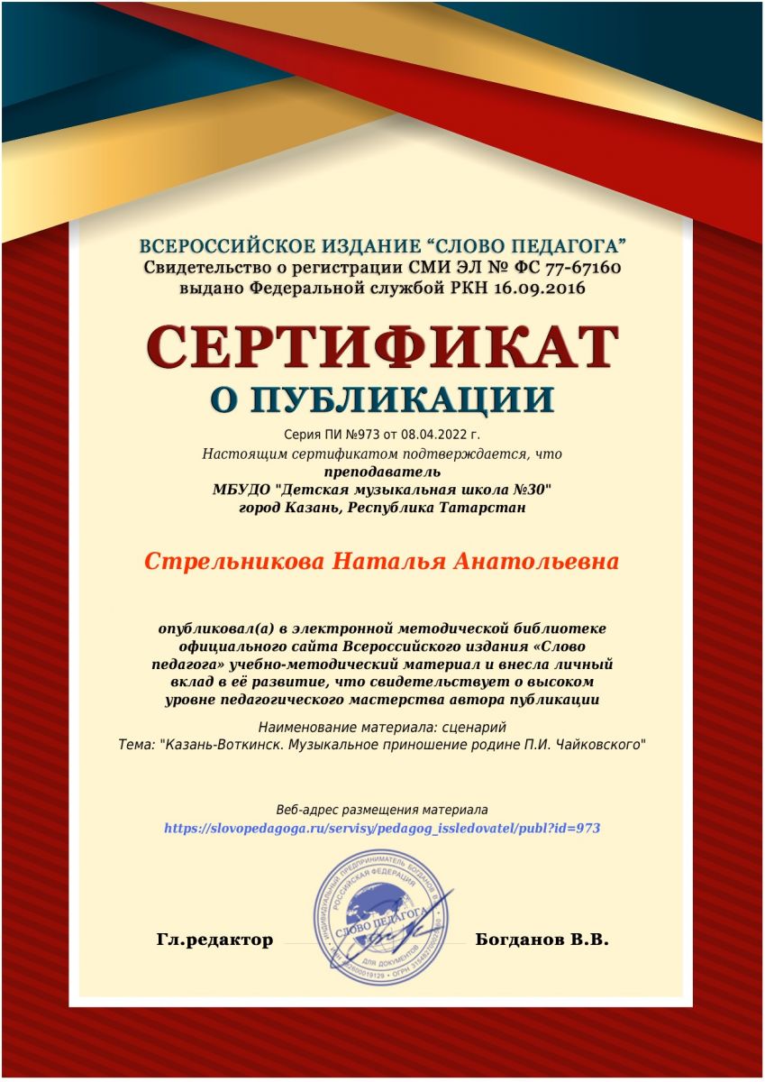 Всероссийское издание СМИ "Слово педагога" - сценарий Стрельниковой Н.А. "Казань-Воткинск. Музыкальное приношение родине П.И.Чайковского" - сертификат