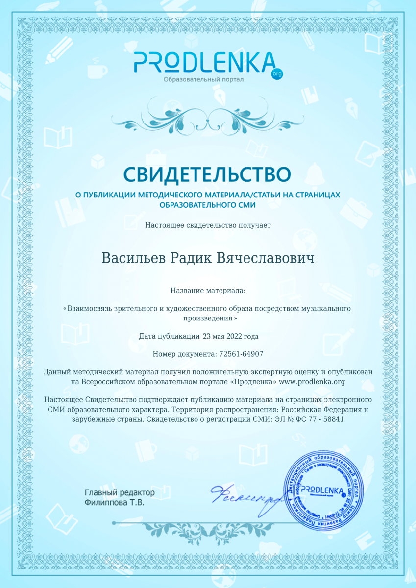 Образовательный портал PRODLENKA - Васильев Р.В. опубликовал статью "Взаимосвязь зрительного и художественного образа посредством музыкального произведения" - свидетельство