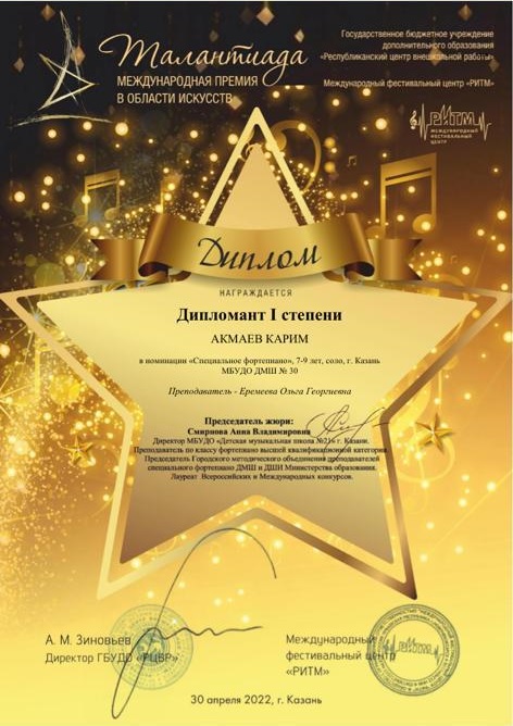 Международный конкурс "Талантиада" - Акмаев Карим - диплом I степени