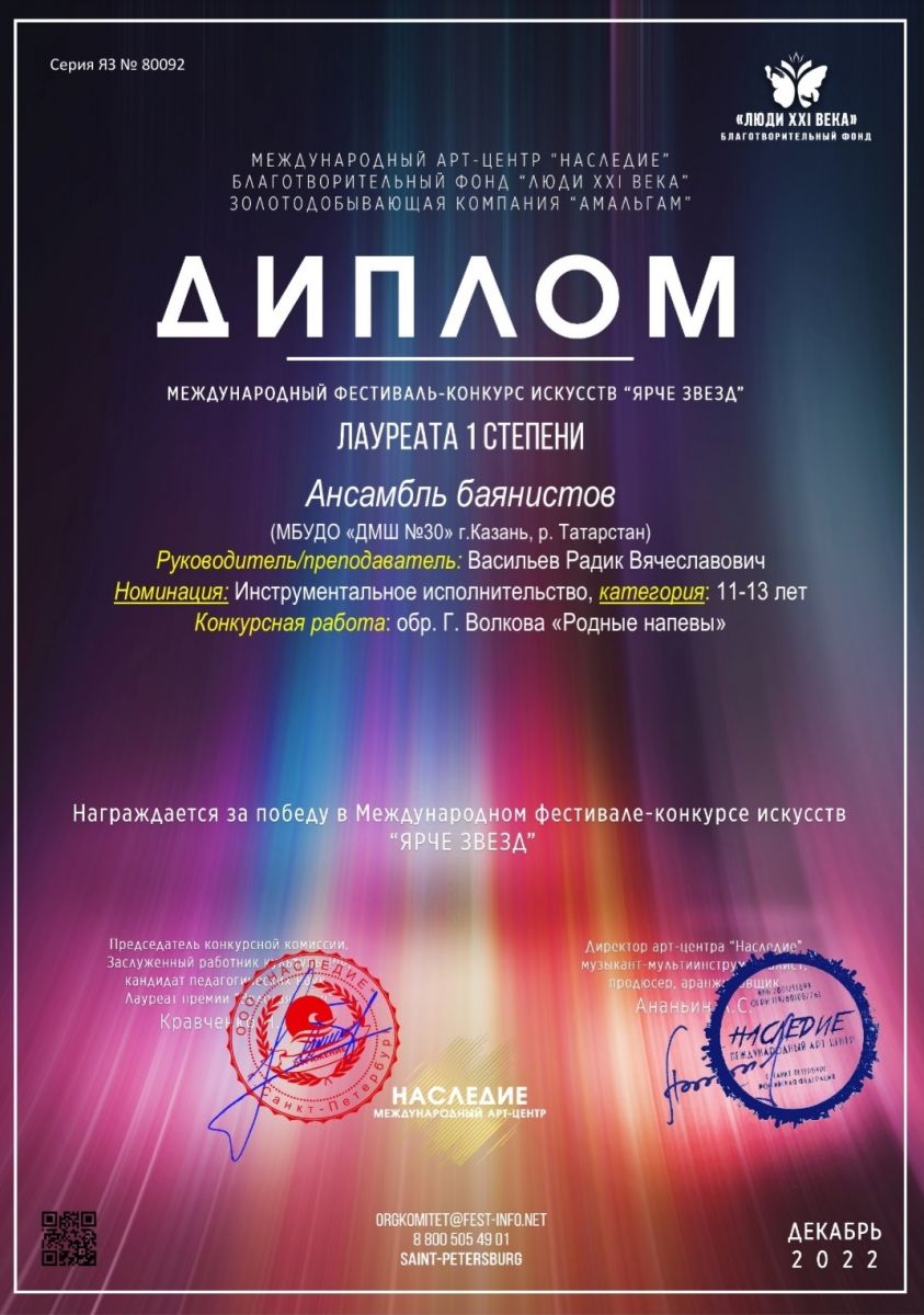 Международный фестиваль-конкурс искусств "Ярче звезд" - ансамбль баянистов - I место
