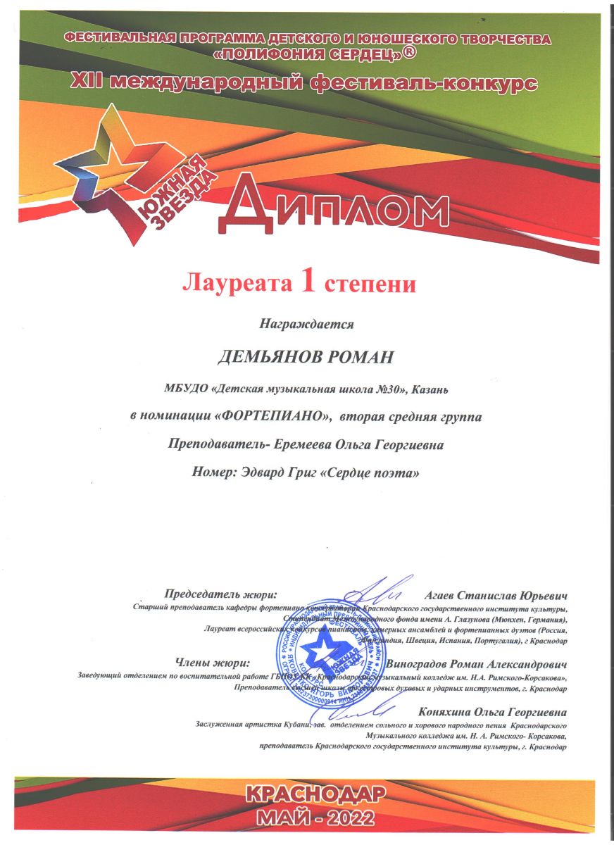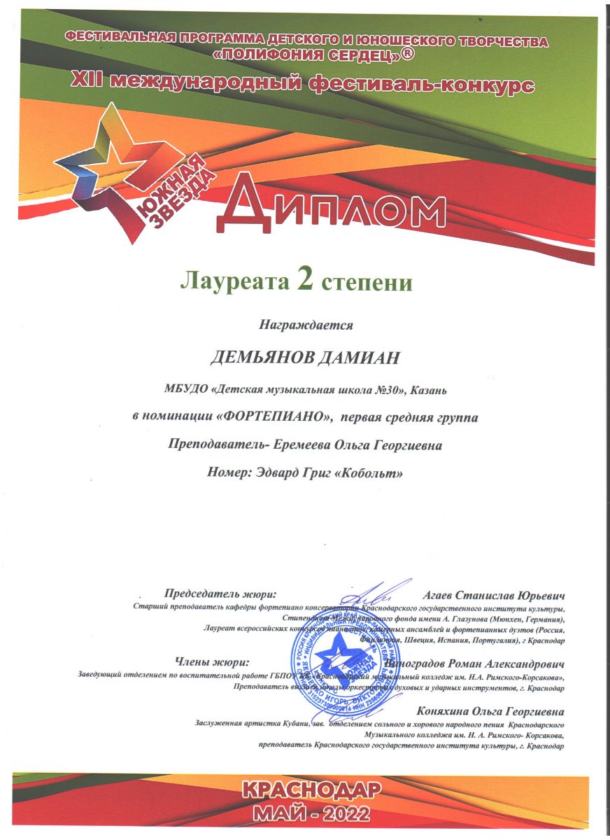 XII Международный фестиваль-конкурс "Южная звезда" - Демьянов Дамиан - II место