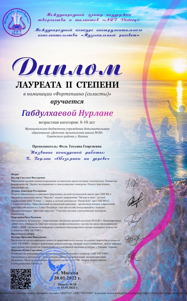 Международный конкурс исполнителей общего фортепиано "Белый рояль" - Сабирова Камиля - II место