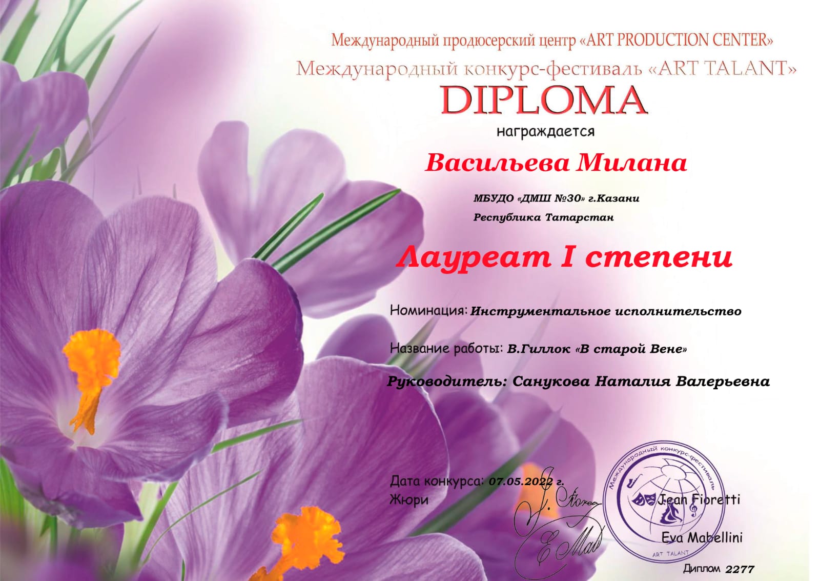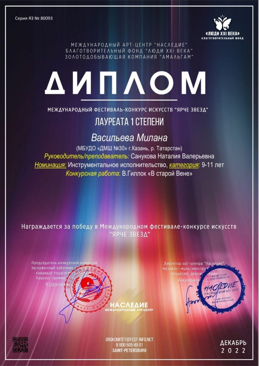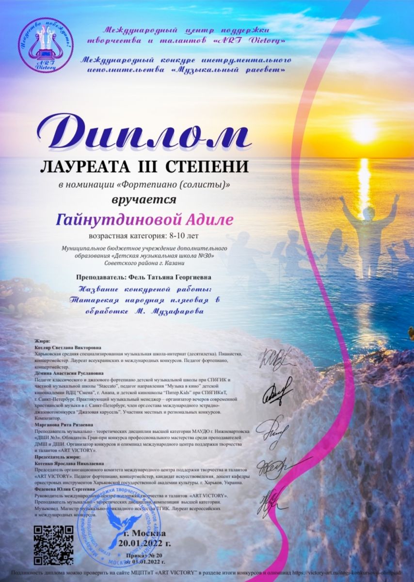 Международный конкурс искусств "Симфония талантов" - Сабирова Камиля - III место