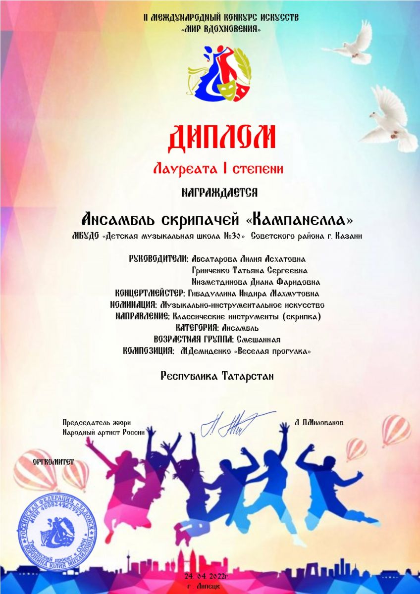 II Международный конкурс искусств "Мир вдохновения" - ансамбль скрипачей "Кампанелла" - I место