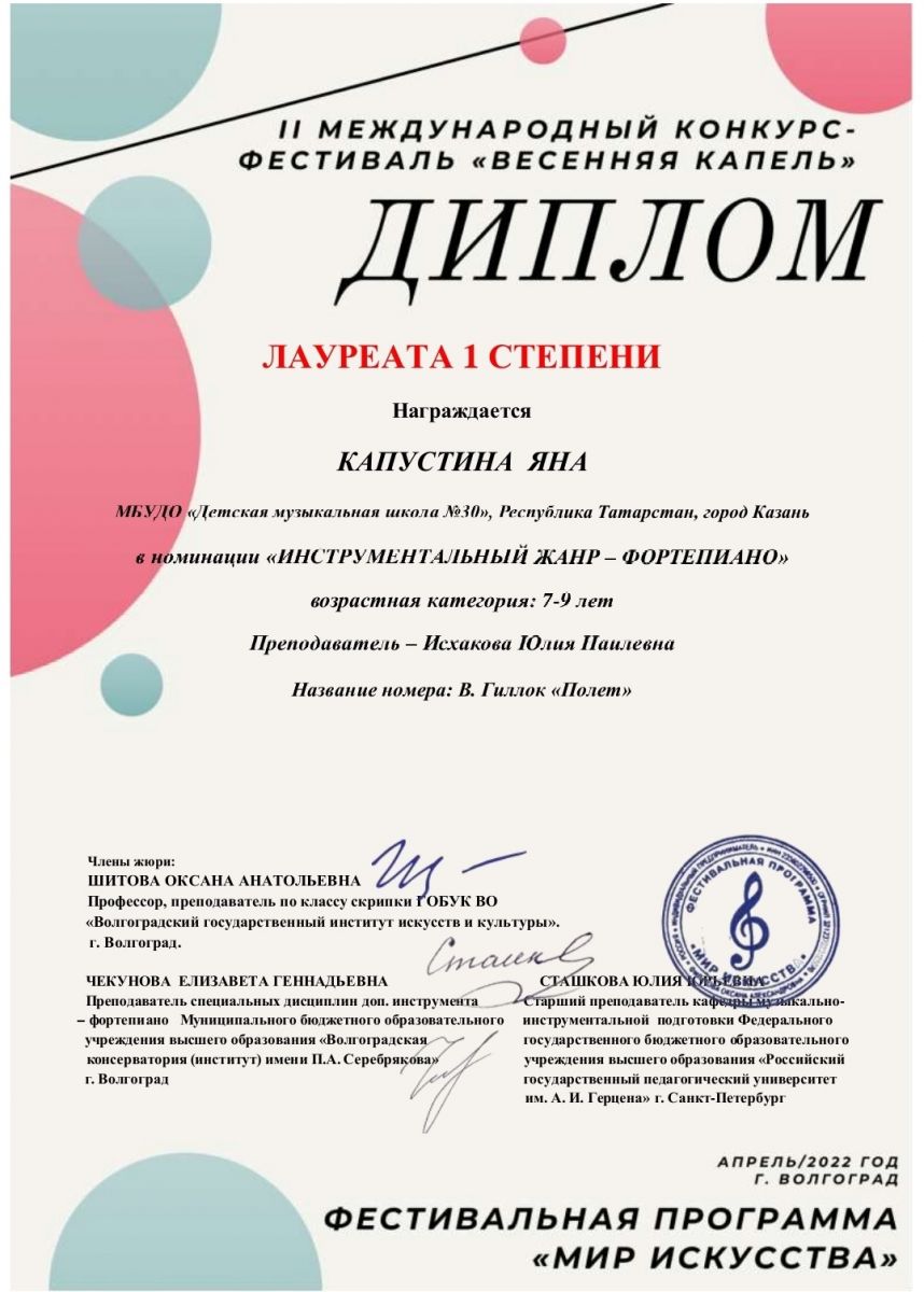 II Международный конкурс-фестиваль "Весенняя капель" - Капустина Яна - I место